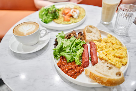 Beautifully decorated toast with salmon and avocado, egg benedict and cappuccino Breakfast is the go-to time for meetings