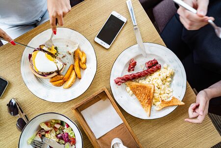 Closeup of business people hands, male and female having breakfast at outdoors cafe. Meals with salad, omelette, bacon