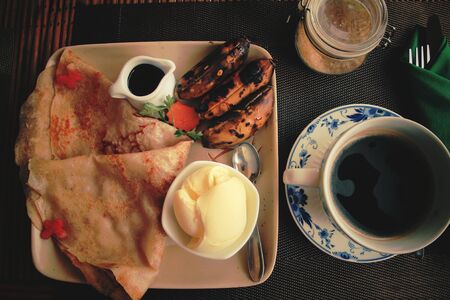 Vegan breakfast of rice pancake, grilled banana and coconut ice cream
