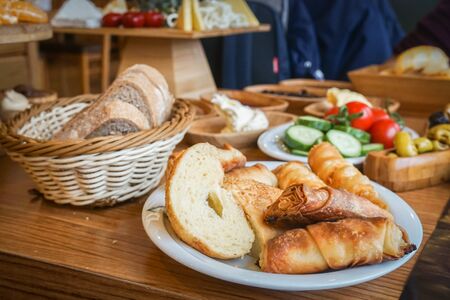 close up selective focus Turkish traditional breakfast of baked bread with vegetable and cheese