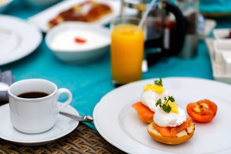 Western big gourmet breakfast selection mixed dishes on french restaurant table