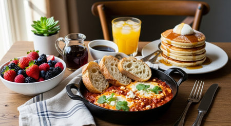 Colorful breakfast spread on wooden table