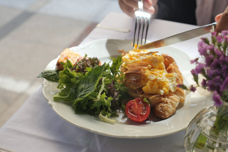Delicious croissant with salad and eggs served at brunch