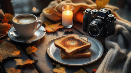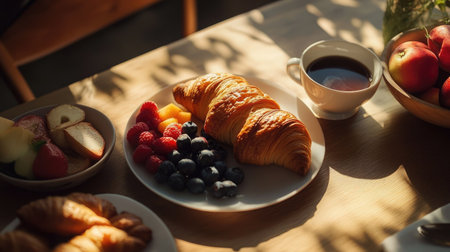 A cozy breakfast scene featuring a croissant, fresh berries, and a cup of coffee. Perfect for showcasing morning warmth and delightful flavors.