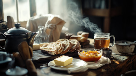 A cozy breakfast setting featuring freshly sliced bread with butter and jam, accompanied by a steaming cup of tea in a rustic kitchen atmosphere.