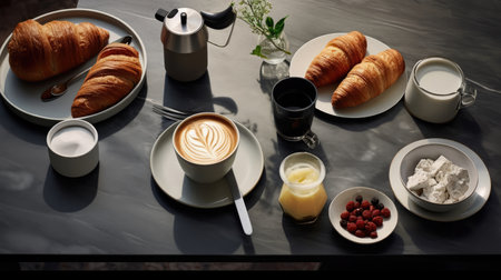 A traditional European breakfast of croissants, jam, and coffee, beautifully presented on a table. No one is eating -