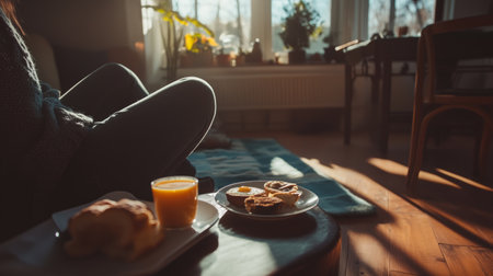 Morning leisure with fresh pastries and juice in a sunlit living room, showcasing a cozy atmosphere and relaxed vibe