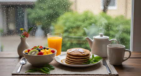 A cozy breakfast setting sits by a window covered in rain droplets, looking out onto a green garden. The table features pancakes with syrup, a fruit bowl, orange juice, and a steaming teapot, creating a comforting and relaxing mood.