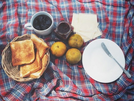 Enjoying a relaxing breakfast with fried eggs, toast, coffee, fresh fruit and a good book on a wooden table