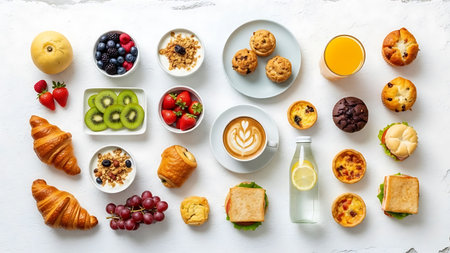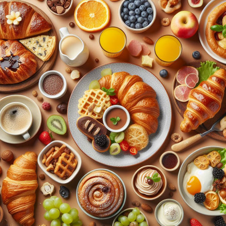 Colorful collage highlights various breakfast selections including fresh fruits, pastries, and beverages. Brightly arranged setting emphasizes morning meals.