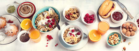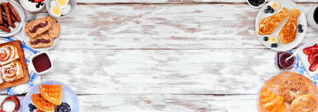 Breakfast or brunch table scene on a white wood banner background. Top view. Variety of sweet and savory food items.