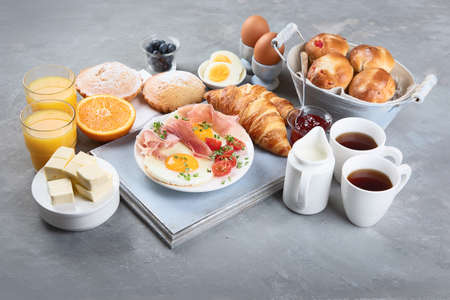 Various traditional breakfast food - fried eggs with bacon, muesli, oats, waffles, pancakes, burger, croissants, fruit berry, coffee, tea and orange juice, white table background copy space top view