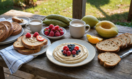 Breakfast on a sunny morning on the veranda. Food menu on a wooden table, pastries, berries, fresh on a rustic wooden table outdoors. Generative AI.