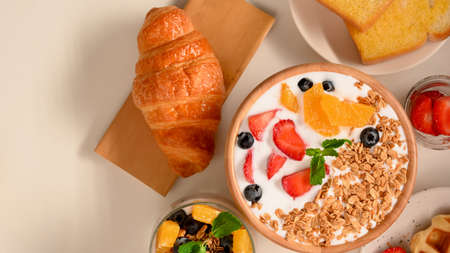 Top view of a yummy healthy breakfast set with homemade granola yogurt bowl with fresh fruits, baked croissant, toasts and fresh fruit on table.