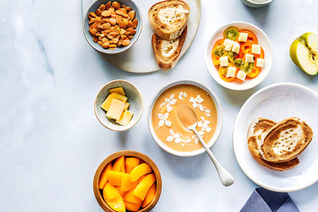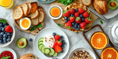 Vibrant spring breakfast spread with fresh fruits and flowers.