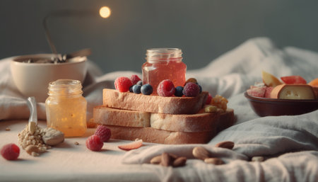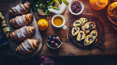 Fresh bakery assortment with croissants, jam, and coffee. Rustic breakfast table in cozy morning light.