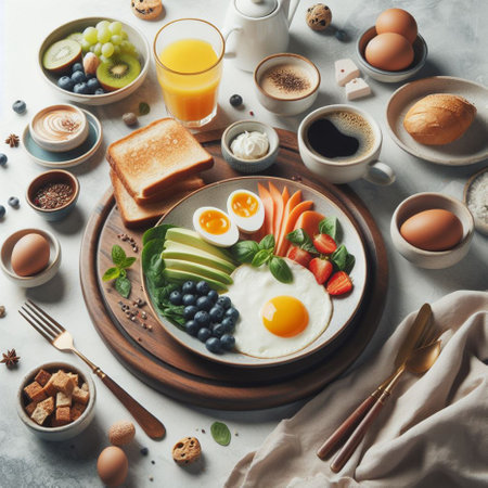 healthy breakfast, with eggs, fruit, and toast, created with generative ai