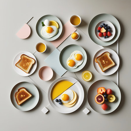 A visually appealing flat lay composition presents a breakfast spread with a modern aesthetic. Plates and bowls contain fried eggs, toast, and a variety of fresh fruits including berries, orange slices, and kiwi. Geometric shapes and pastel colors are integrated into the arrangement, enhancing the clean and artistic presentation.