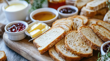 A rustic wooden board featuring a variety of toasted bread, accompanied by bowls of butter, honey, and assorted jams, inviting a delightful breakfast experience.