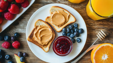 A top-down view of crispy toast served with a variety of spreads--peanut butter, jam, and honey--on a white plate, with fresh fruit and a glass of orange juice nearby.