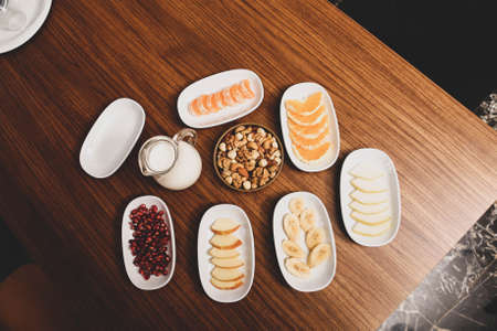 Homemade Granola Muesli Oatmeal for Breakfast Food, Granola With Fresh Fruit and Bread Bake for Breakfast. Natural Baked Muesli and Mixing Fruits for Morning Meals. Nutrition Homemade Granola Food
