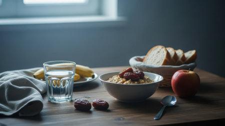 A rustic wooden table set with a bowl of oatmeal topped with nuts, a glass of water, slices of bread, fresh fruit including bananas and apples, and a spoon. The scene is illuminated by soft natural light from a nearby window.