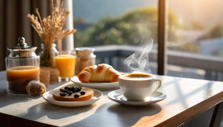 Breakfast with coffee and croissants on the table in morning light