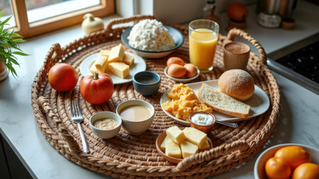 Cozy breakfast spread with apples, eggs, bread, and fresh juices on woven tray by window. That the image is generated using AI.