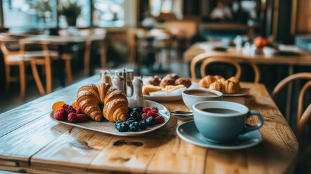 An empty Western cafe with a table set for brunch, featuring croissants, coffee, and fresh fruit. No one is in the cafe