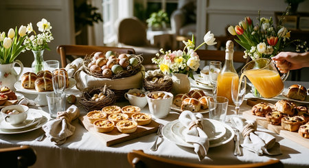 A beautifully set table with a variety of food and flowers for Easter breakfast