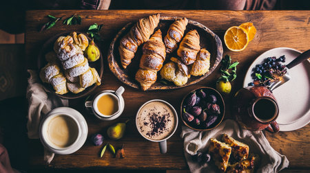 Fresh bakery assortment with croissants, jam, and coffee. Rustic breakfast table in cozy morning light.