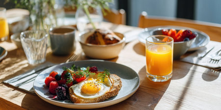 Sunny side up egg on toast with fresh berries and glass of orange juice on wooden breakfast table in natural light