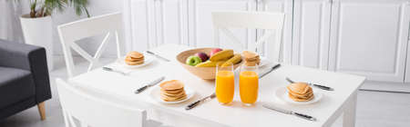 orange juice, delicious pancakes and fresh fruits on white kitchen table, banner