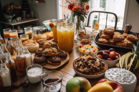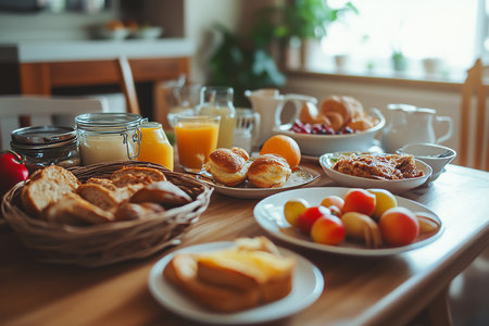 Breakfast table with a variety of food and drinks in the kitchen