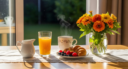 A vibrant and healthy breakfast table setting featuring a croissant with berries, a glass of orange juice, and a hot cup of coffee. Sunlight streams through a window onto the wooden table, illuminating a vase of orange flowers and creating a warm morning atmosphere.