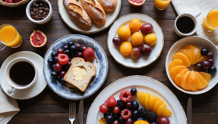 A warm family breakfast scene showcasing delicious dishes on the table. Sunny mornings filled with joy and connection before the day's work begins. Ideal for lifestyle themes.