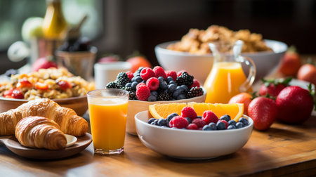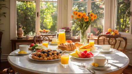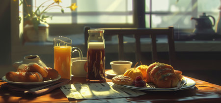A serene breakfast setting with fresh pastries and orange juice, bathed in warm sunlight, perfect for cozy morning gatherings with family and friends.