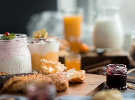 different cream mousses with berry and buns for breakfast on a wooden table