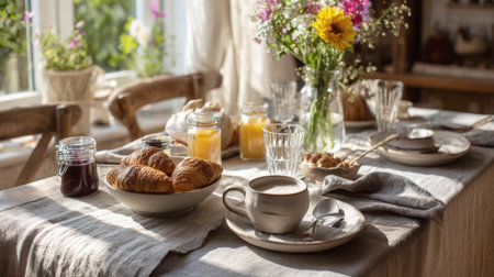 A cozy, sun-drenched breakfast table set for two with freshly baked croissants, coffee, and orange juice. The rustic setting features linen tablecloths, a vibrant flower bouquet, and natural light streaming through the window.