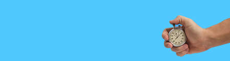 Banner, stopwatch in hand on a blue background, sports concept