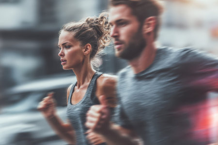 Two athletes are racing intensely on a city street as dusk approaches, showing their speed and determination.