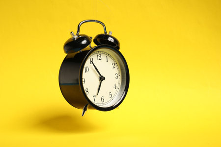 Black alarm clock in air on yellow background, space for text