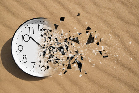 Concept of passing away, the clock breaks down into pieces. Analog clock in the sand, with dispersion effect.