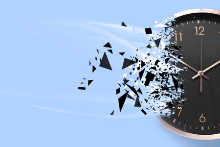 Time running out. Clock dissolving on light blue background