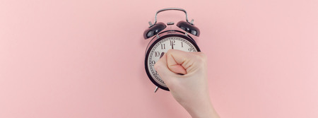 Creative banner morning time emotions concept top view of woman hand holding black vintage alarm clock pastel millennial pink color paper background with copy space minimal style template for text