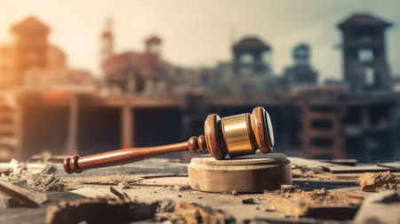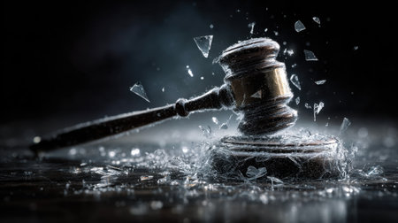 This striking image depicts a broken gavel resting amid shards of glass, representing the fragile nature of justice and the legal system's vulnerabilities.