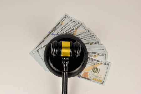 The weighty gavel, positioned amidst a stack of money, suggests the significant financial implications of legal decisions.
