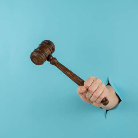 Hand holding a judge's gavel through torn blue paper wall. Law and courts, triumph of justice.