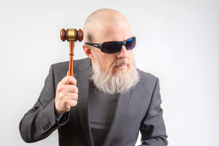 A stern bearded man in a gray suit and sunglasses holds a gavel, exuding authority and judgment against a plain background, ideal for legal themes.