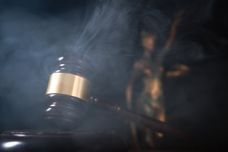 Law, justice concept. Creative artwork table decoration with mallet of the judge on dark foggy background with colorful light. Selective focus